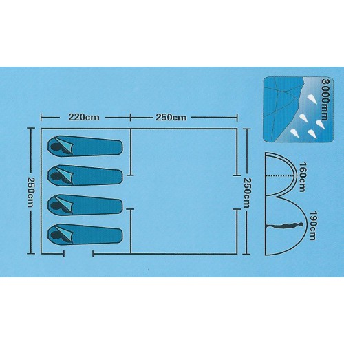 • Flysheet: 190T полиэстер, с полиуретановым покрытием, водонепроницаемый 3000мм самоклеящихся этикеток.