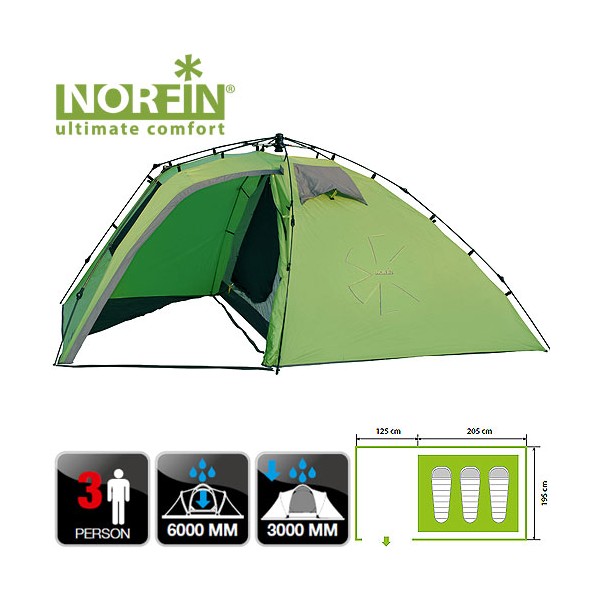 Двухслойная 3-х местная палатка Norfin Peled 3 с полуавтоматическим быстро сборным каркасом. Просторный тамбур на входе в палатку. Внутренняя палатка и тент устанавливаются одновременно. Установка палатки может быть совершена одним человеком за считанные секунды.