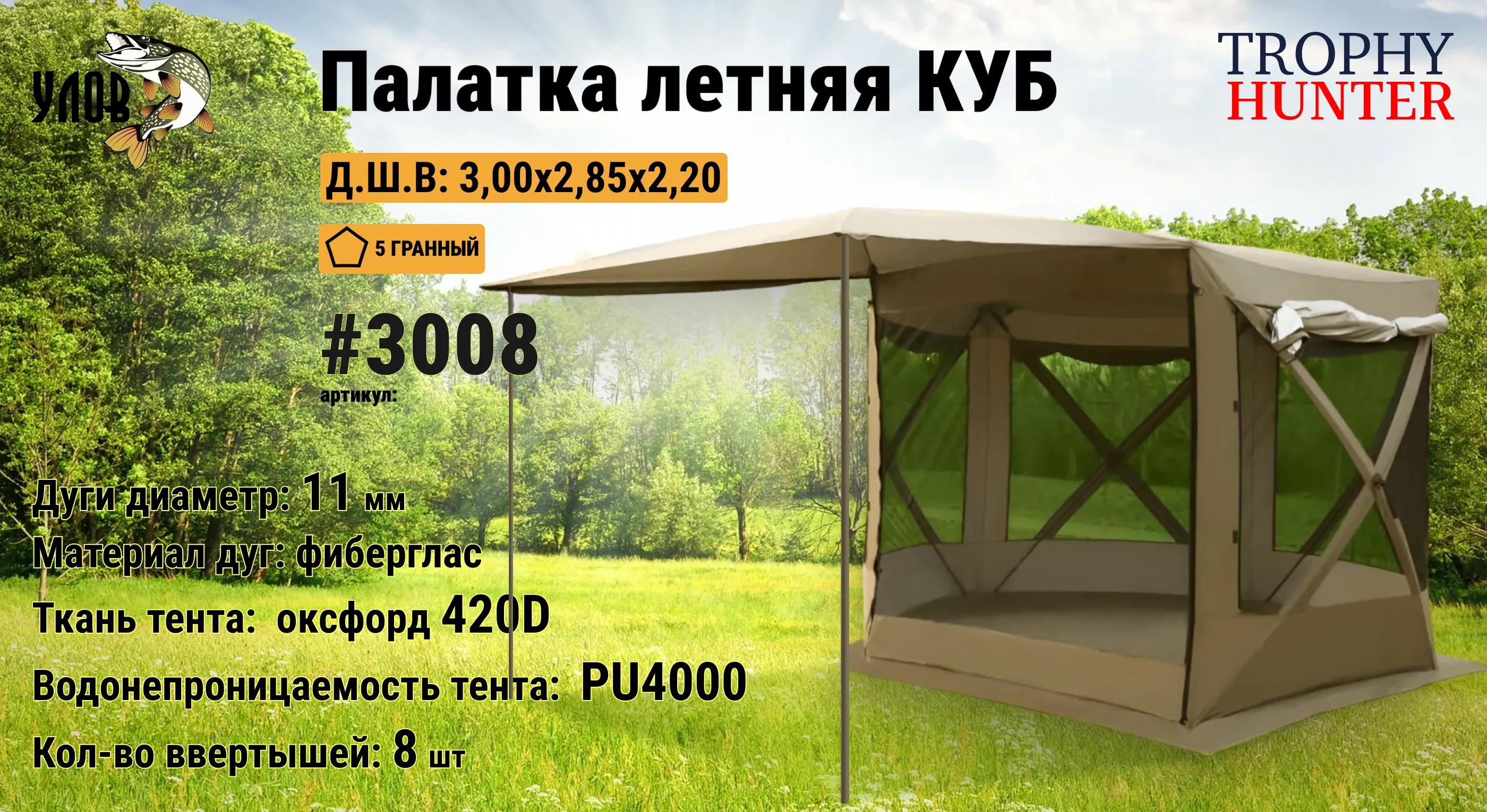 Палатка летняя КУБ 5-ти гранный имеет в комплекте пол и дополнительный тент. Представляет собой идеальное сочетание функциональности и удобства для вашего отдыха на природе. Благодаря вместительному каркасу и устойчивой конструкции, он подойдет как для семейных обедов и вечерних чаепитий с друзьями на даче или в саду, так и для активного отдыха на рыбалке или охоте. Оборудованный ветрозащитной юбкой и влагозащитной тканью, шатер защитит вас от ветра, дождя и ультрафиолетовых лучей. Надежная стальная конструкция и вентиляционная система обеспечат комфортную зону отдыха даже в жаркий солнечный день. Благодаря москитной сетке и шторам, вы также будете защищены от назойливых комаров. Кроме того, шатер оснащен садовой беседкой и летней кухней, что позволит вам создать идеальное место для приятного времяпрепровождения с семьей или компанией.