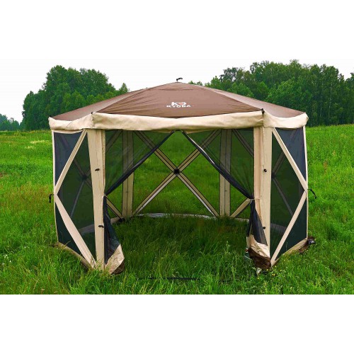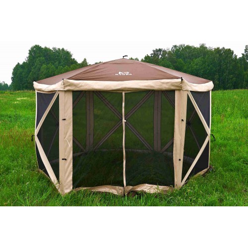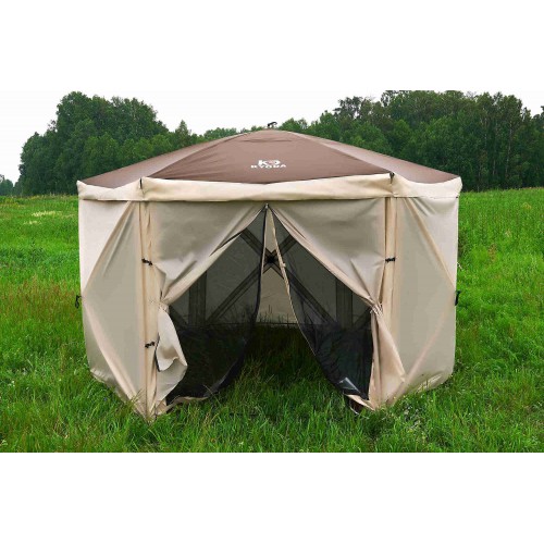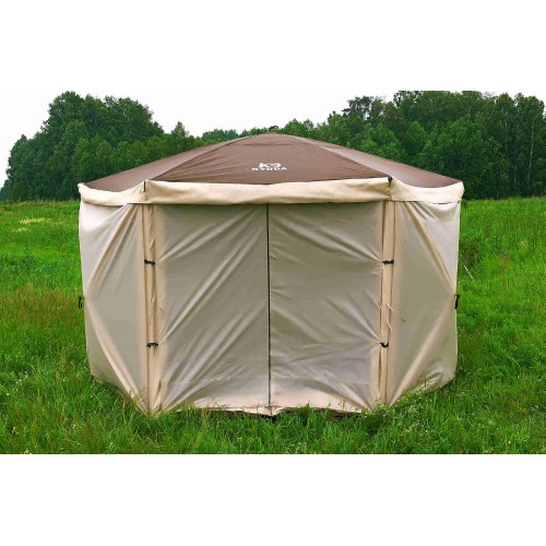 Представьте то, без чего не обойдется ни один отдых на природе. И это шатер KYODA. Большой, крепкий и легкий шатер имеет шесть сторон.Механизм сборки и разборки - самый популярный и надежный зонт. Крыша и стены шатра собираются легким усилием за крепкую петлю. Зонты оснащены крепким стеклопластиковыми дугами, а крепежные узлы выполнены из литого силумина. Каждая стена выполнена из москитной сетки, что надежно защитит Вас от москитов. Также шатер дополнен закрывающими шторами на каждую стену, чтобы защититься от ветра и дождя. По всем углам шатер имеет петли, за которые он крепится к земле входящими в комплект металлическими колышками. Вход шатра укрепляется сборной аркой из стеклопластиковых дуг. Вход в шатер закрывается магнитом, а на шторе - замком. Шатер выдерживает столб воды 3000мм.