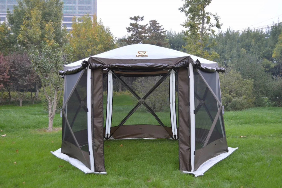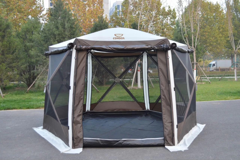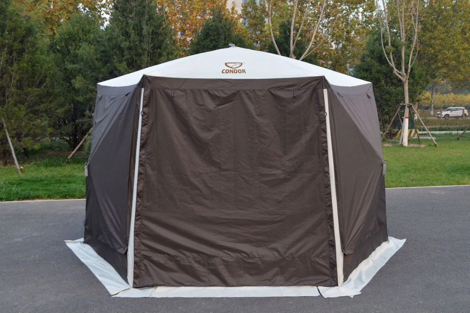 Представьте то, без чего не обойдётся ни один отдых на природе. И это шатёр CONDOR! Большой, крепкий и лёгкий шатёр CONDOR имеет шесть сторон. Механизм сборки и разбора – самый популярный и надёжный зонт. Крыша и стены шатра собираются лёгким усилием за крепкую петлю. Зонты оснащены крепкими стеклопластиковыми дугами диаметром 11 мм, а крепёжные узлы выполнены из литого силумина. Каждая стена выполнена из москитной сетки, что надёжно защитит Вас от москитов. Пол оснащён отстёгивающимся полом, который выдерживает столб воды 3500 мм. Также шатёр дополнен закрывающими шторами на каждую стену, чтобы защититься от ветра и дождя. По всем углам шатёр имеет крепёжные петли, за которые он крепится к земле входящими в комплект металлическими колышками. Вход в шатёр закрывается замком.