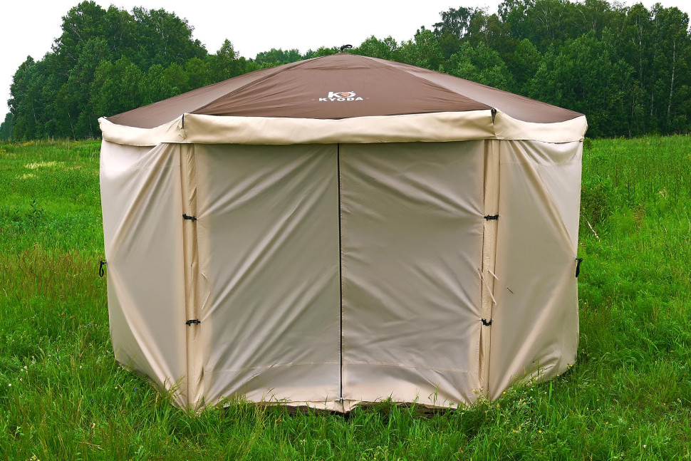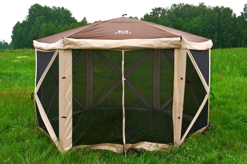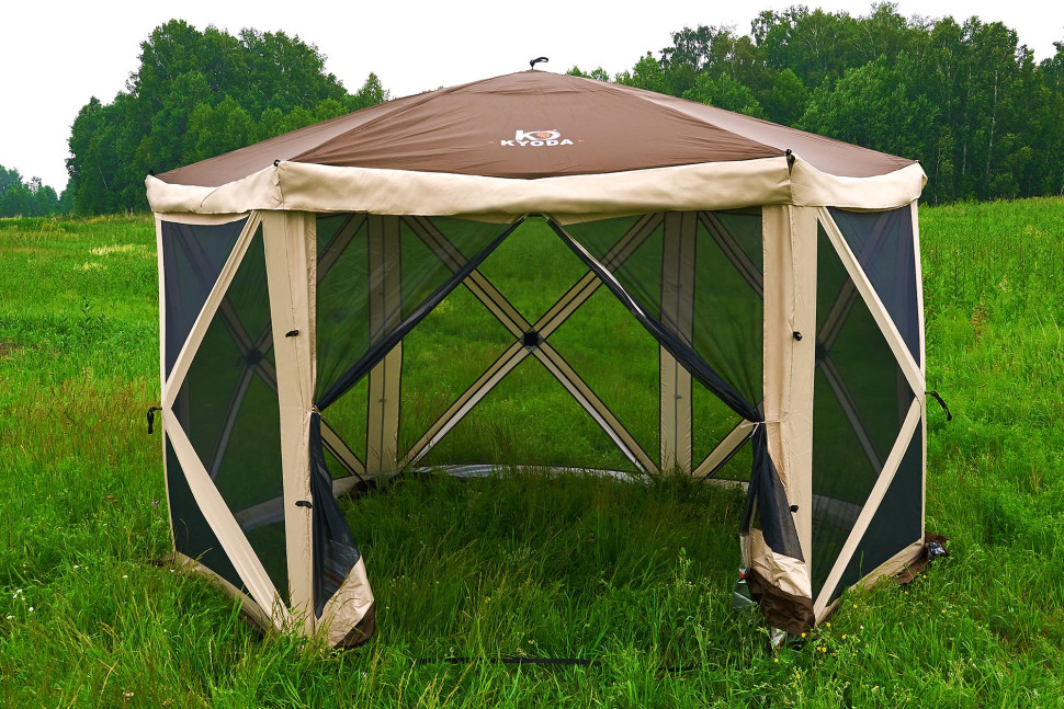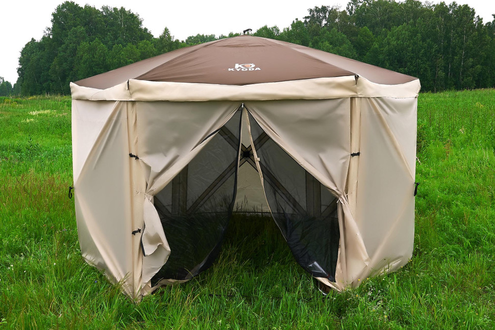 Представьте то, без чего не обойдётся ни один отдых на природе. И это шатёр KYODA! Большой, крепкий и лёгкий шатёр KYODA имеет шесть сторон. Механизм сборки и разбора – самый популярный и надёжный зонт. Крыша и стены шатра собираются лёгким усилием за крепкую петлю. Зонты оснащены крепкими стеклопластиковыми дугами, а крепёжные узлы выполнены из литого силумина. Каждая стена выполнена из москитной сетки, что надёжно защитит Вас от москитов. Также шатёр дополнен закрывающими шторами на каждую стену, чтобы защититься от ветра и дождя. По всем углам шатёр имеет крепёжные петли, за которые он крепится к земле входящими в комплект металлическими колышками. Вход шатра укрепляется сборной аркой из стеклопластиковых дуг. Вход в шатёр закрывается магнитом, а на шторе – замком.