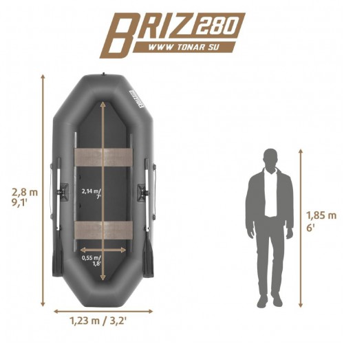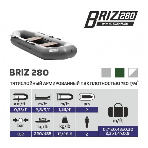 Надувная лодка «БРИЗ 280» производства ГК "ТОНАР" двухместная лодка с классической О-образной формой. Баллон лодки разделен перегородками на 2 независимых отсека, что гарантирует безопасность пребывания на воде. Просторный кокпит позволит свободно разместиться двум пассажирам и при этом удобно расположить необходимый груз. На лодке используется современная и надежная фурнитура отечественных производителей. Лодка идеально подойдет как для любителей рыбалки и охоты, так и для прогулок и отдыха на воде. Рекомендованные районы плавания: закрытые акватории, небольшие озера, реки.