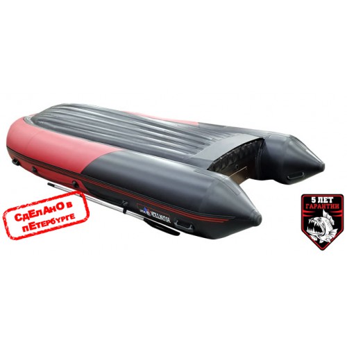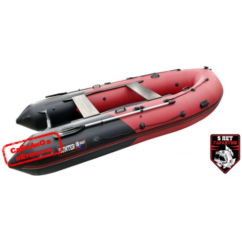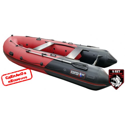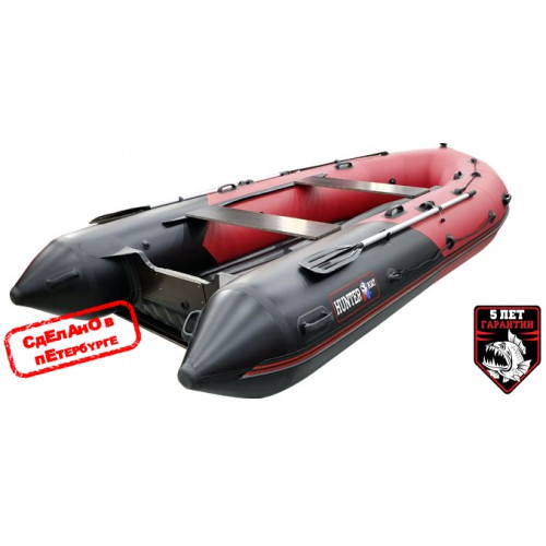 Надувная лодка Хантер 380 ПРО со стационарным вклеенным умеренно-килевым дном низкого давления (НДНД) рассчитана на использование с мотором до 25 л.с. с максимальной загрузкой до 750 кг. Предназначена для рыбалки, охоты и активного отдыха на воде небольшой компанией. Выпускается в двух расцветах - комбинированном красно/черном цвете и комбинированном черно/камуфлированном цвете.