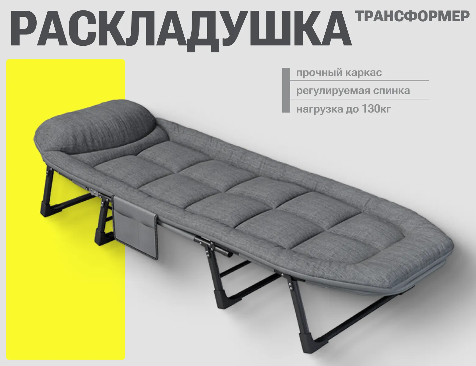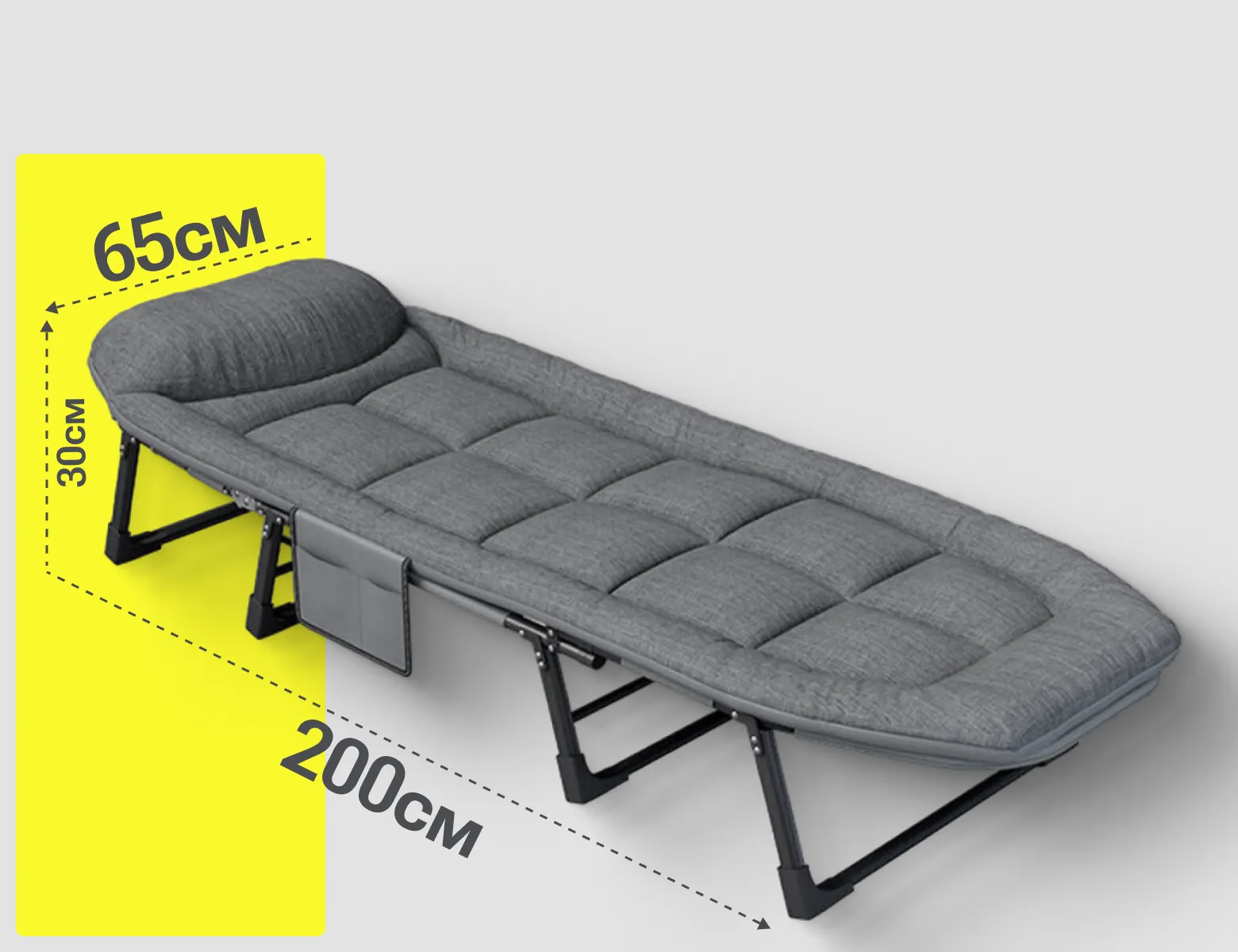 Очень удобная. Можно регулировать угол наклона спинки, до 90 градусов. В сложенном виде занимает мало места. Чехол-накидка в комплекте. Характеристики Длина: 200 см. Ширина: 65 см. Высота: 30 см. Заявленная нагрузка 150 кг. Походная раскладушка-кровать, с матрасом, туристическая, складная, лежак, для охоты, рыбалки, активного отдыха, в палатку, трансформер, с чехлом, мягкий подголовник.