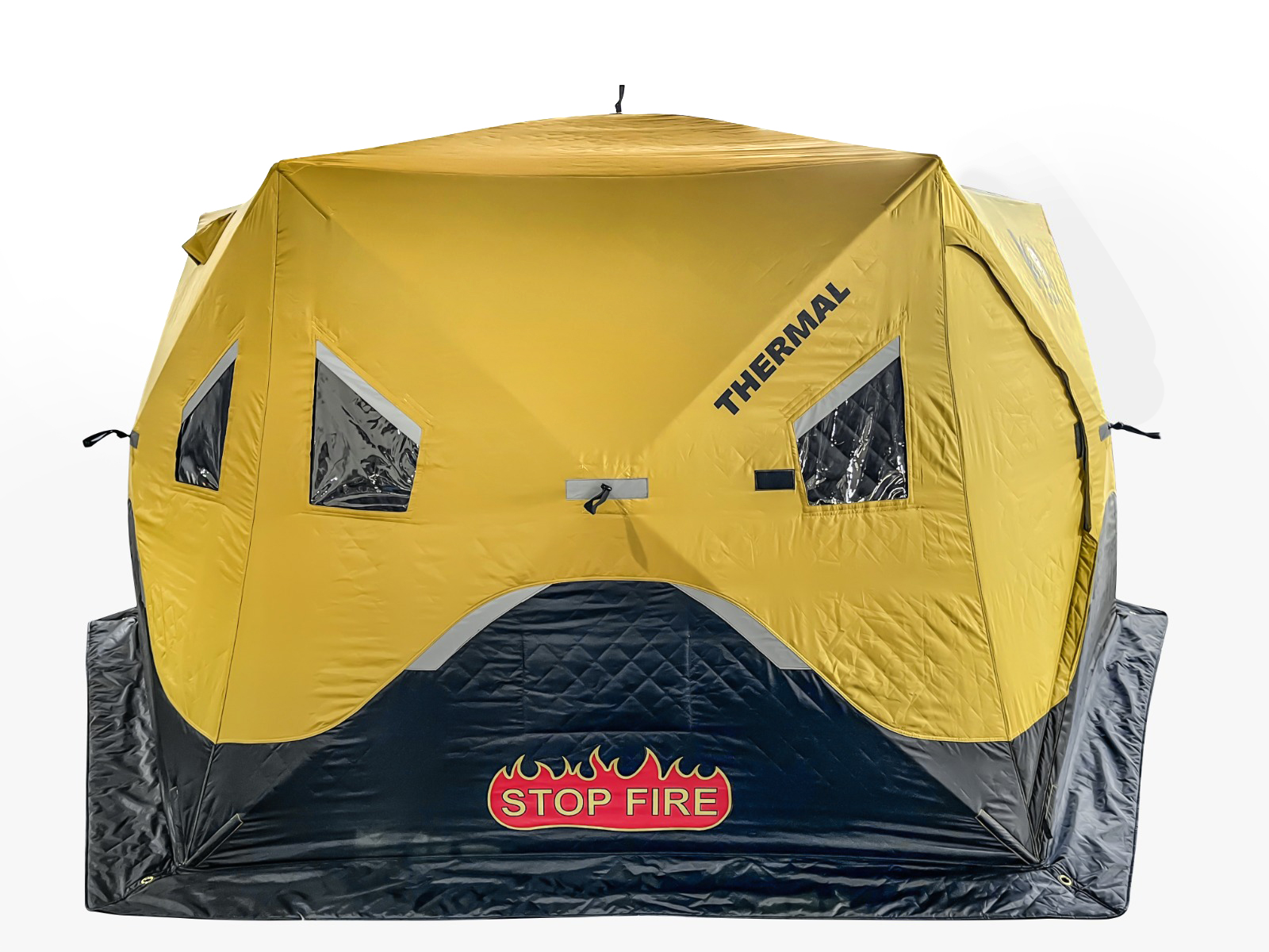 Зимняя палатка куб KYODA, которую можно быстро установить и демонтировать. В палатке установлены окна из материала ПВХ, которые можно закрыть специальными клапанами. Конструкция рамы выполнена из 11-ти миллиметрового долговечного стеклопластика. Замки высокого качества гарантируют работу дверей даже в холодную погоду. Материал палатки представляет собой специальную трехслойную ткань из материала Oxford с покрытием ПВХ, в качестве основной ткани, термоизоляционный слой между ним и подкладкой внутри. Водостойкость ткани 1000 мм. Палатка выполнена без пола и оснащена угловыми кронштейнами для крепления палатки на льду. В крыше имеется отверстие для дымохода, что позволяет использовать печку для обогрева и приготовления пищи. Палатка поставляется с транспортировочной сумкой.