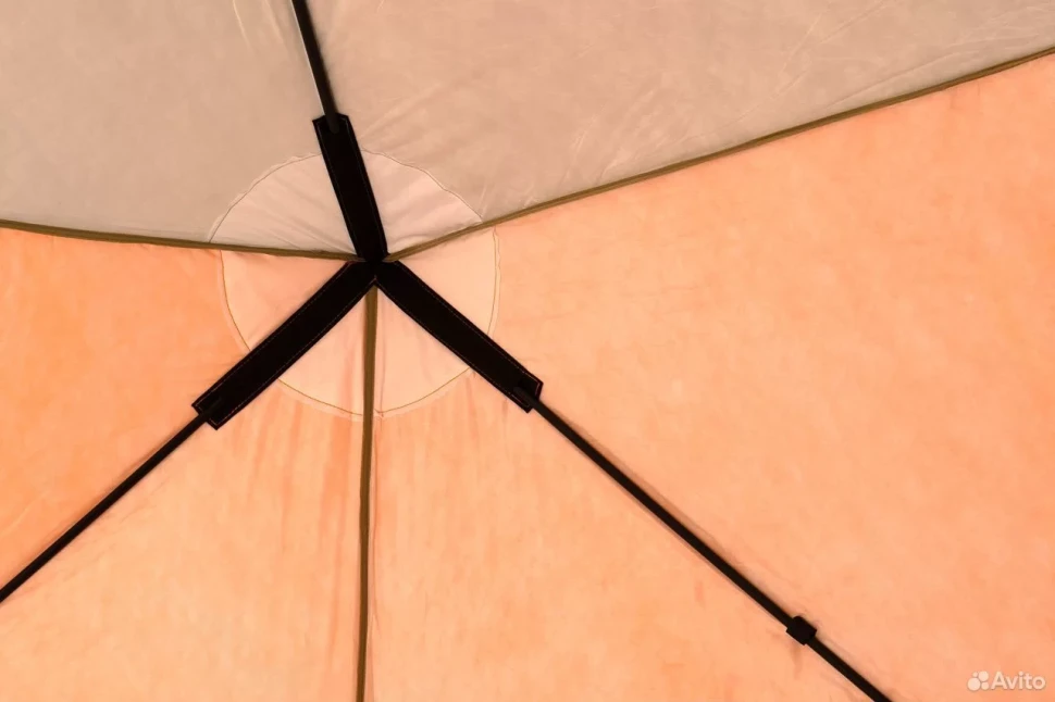 Трехслойный, прoчный, влагooтталкивающий мaтеpиaл тeнта с утеплителем эффективно сохраняет тепло внутри палатки, не продувается и при использовании зимней палатки в светлое время суток пропускает солнечный свет. Специальный выход для дымохода с негорючей разделкой и рукав для притока свежего воздуха обеспечивают комфортный микроклимат.
